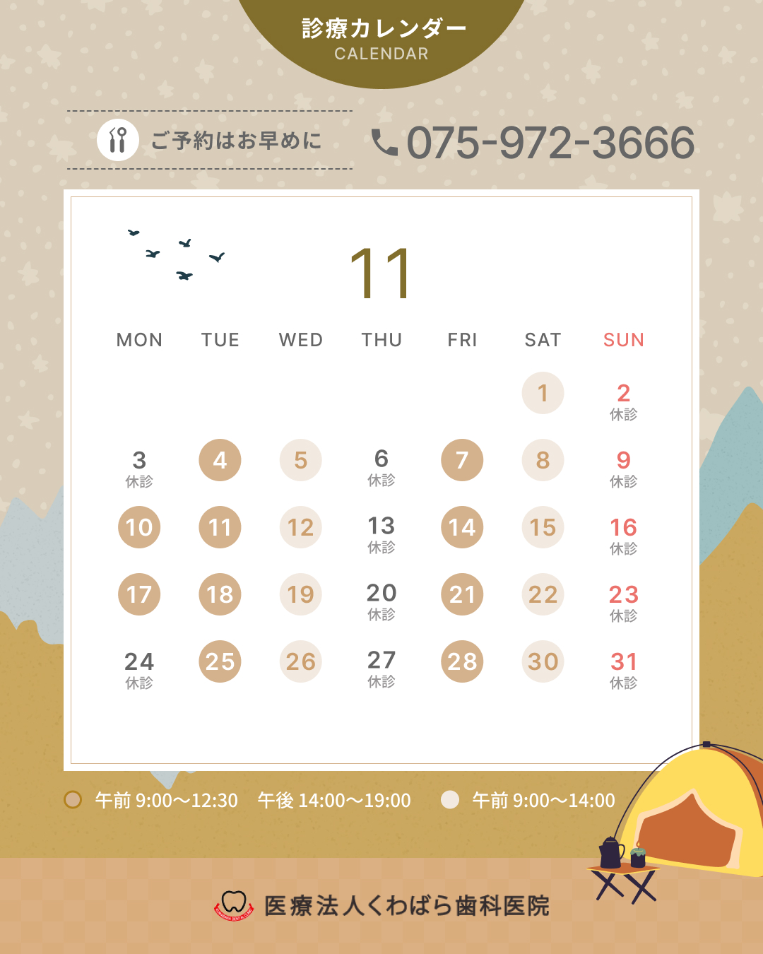 2025.10.31 お知らせ 11月の診療日のお知らせ こんにちは。くわばら歯科医院です。 肌寒い日が増えてきましたね。 来月11月の診療日をご案内いたします。 ご予約はWebサイト・お電話でお願いいたします。