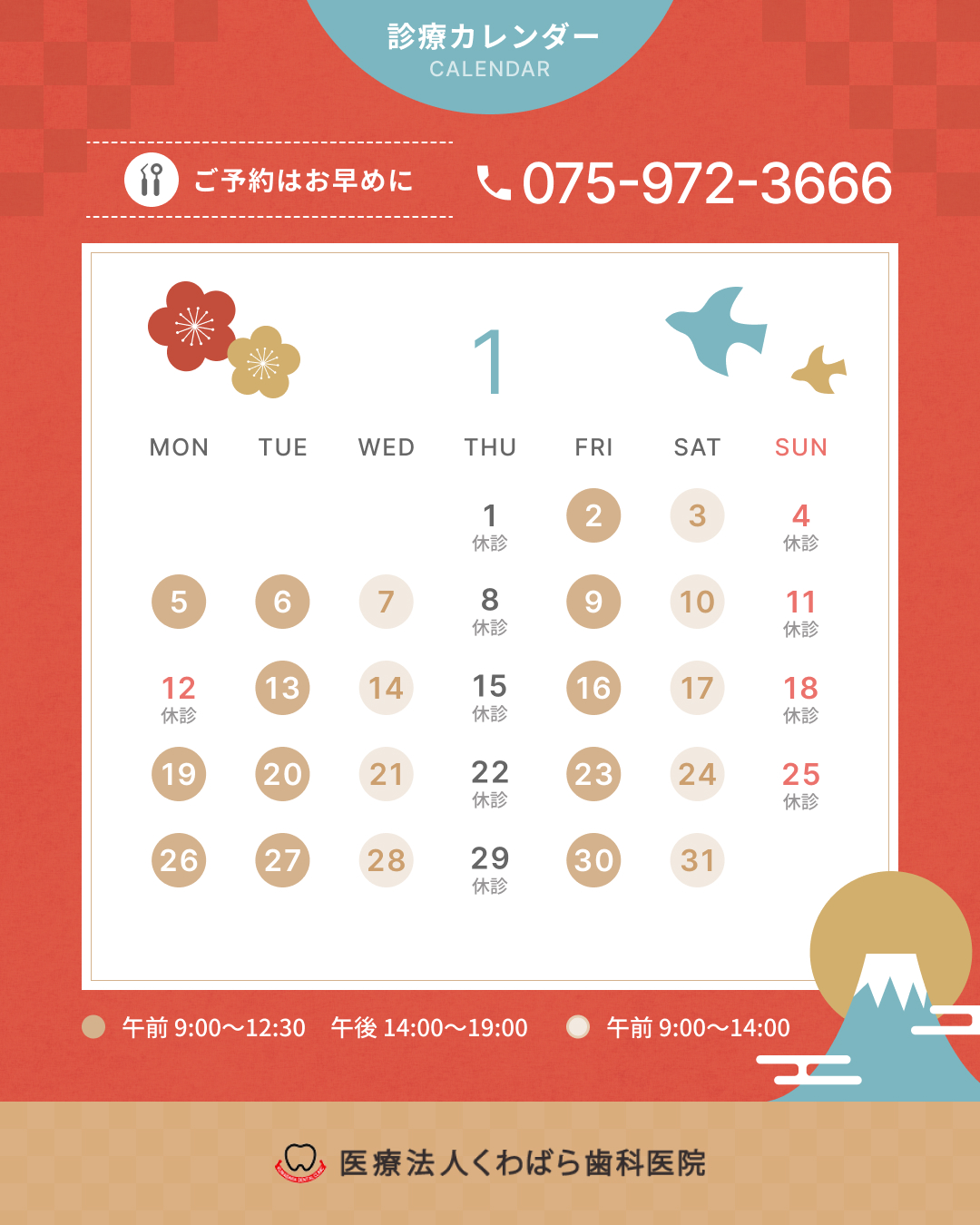 こんにちは。くわばら歯科医院です。 来月1月の診療日をご案内いたします。 ご予約はWebサイト・お電話でお願いいたします。