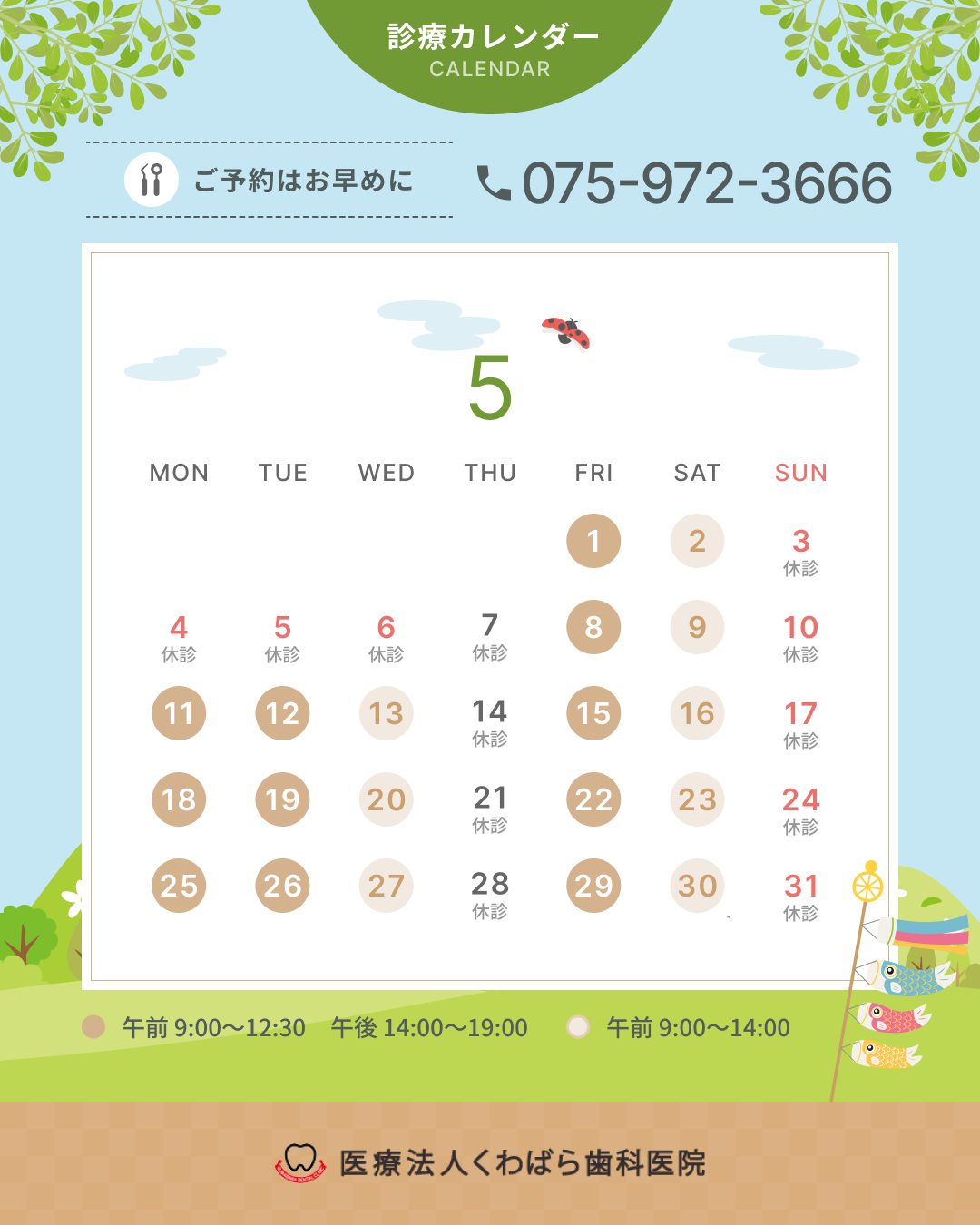 こんにちは。くわばら歯科医院です。 来月5月の診療日をご案内いたします。 ご予約はWebサイト・お電話でお願いいたします。