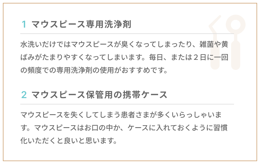 マウスピースを失くしてしまう患者さまが多くいらっしゃいます。マウスピースはお口の中か、ケースに入れておくように習慣化いただくと良いと思います。