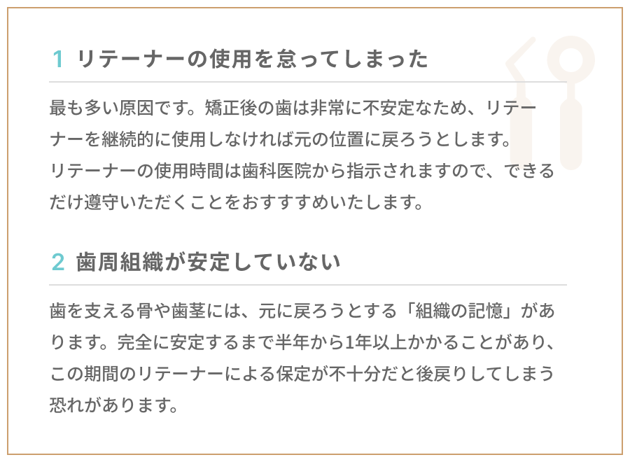 最も多い原因です。矯正後の歯は非常に不安定なため、リテーナーを継続的に使用しなければ元の位置に戻ろうとします。